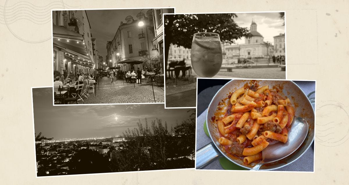 The moment it broke open for me is etched into my memory. I was standing under one of Turin’s porticoes, those massive stone coverings that line the city center, built centuries ago to protect royalty from the elements. It was pouring. I was leaning against the wall, too hesitant to cross the street. One ear filled with the sound of rain slapping pavement. The other pressed to my phone.