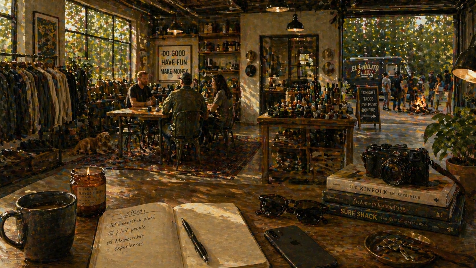 Matchbox Twenty, Fleetwood Mac, Sublime, Red Hot Chili Peppers, Oasis, and other familiar friends over the speakers. The smell of cardboard in the mornings. That productive, particular smell, the one that means something arrived and needs attention. During operating hours, the store’s signature scent settles in: oaky, smoky, something masculine with a quiet note of rose water. By evening, whatever’s keeping the lights on shifts everything. A food truck in the parking lot, a baking class in the kitchen, a bonfire out back. I can feel the day moving through my body. My back and arms and chest and legs, stronger from a more active life. I can see the people helping bring it to life. The way my office looks. The way the it all feels.